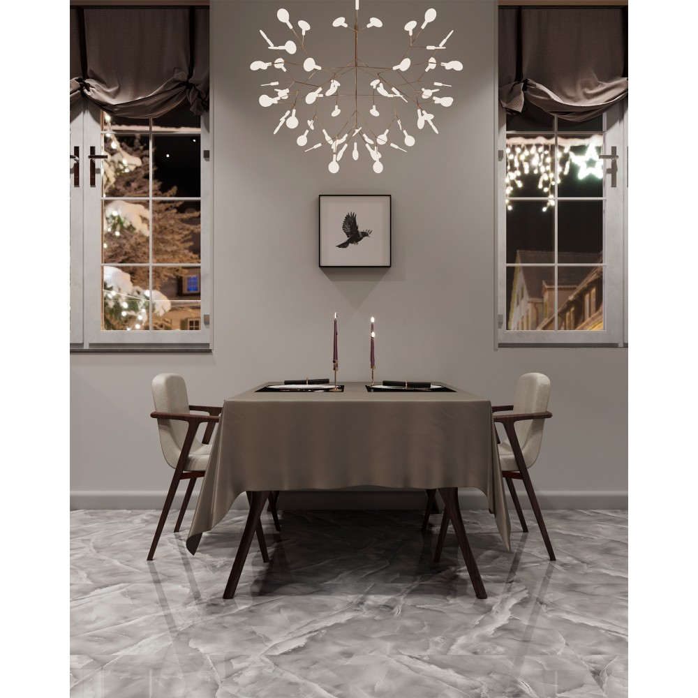 Холодный серый оттенок керамогранита является идеальным фоном для разнообразных стилей интерьера — от минимализма до хай-тека. Светлые прожилки, словно лучи солнца, пробивающиеся сквозь облака, придают материалу особую глубину и динамичность. Такой контраст создает эффект легкости и воздушности, наполняя помещение уютом и гармонией.