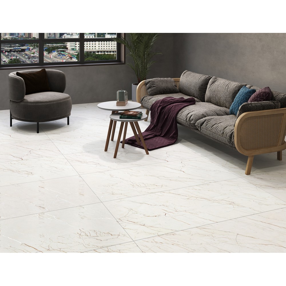 Технология лаппатирования создаёт лёгкий блеск на поверхности, а карвинг придает прожилкам уникальный рельеф. В помещениях с естественным освещением керамогранит переливается мягкими тонами, а в условиях искусственного света приобретает более яркие оттенки.
