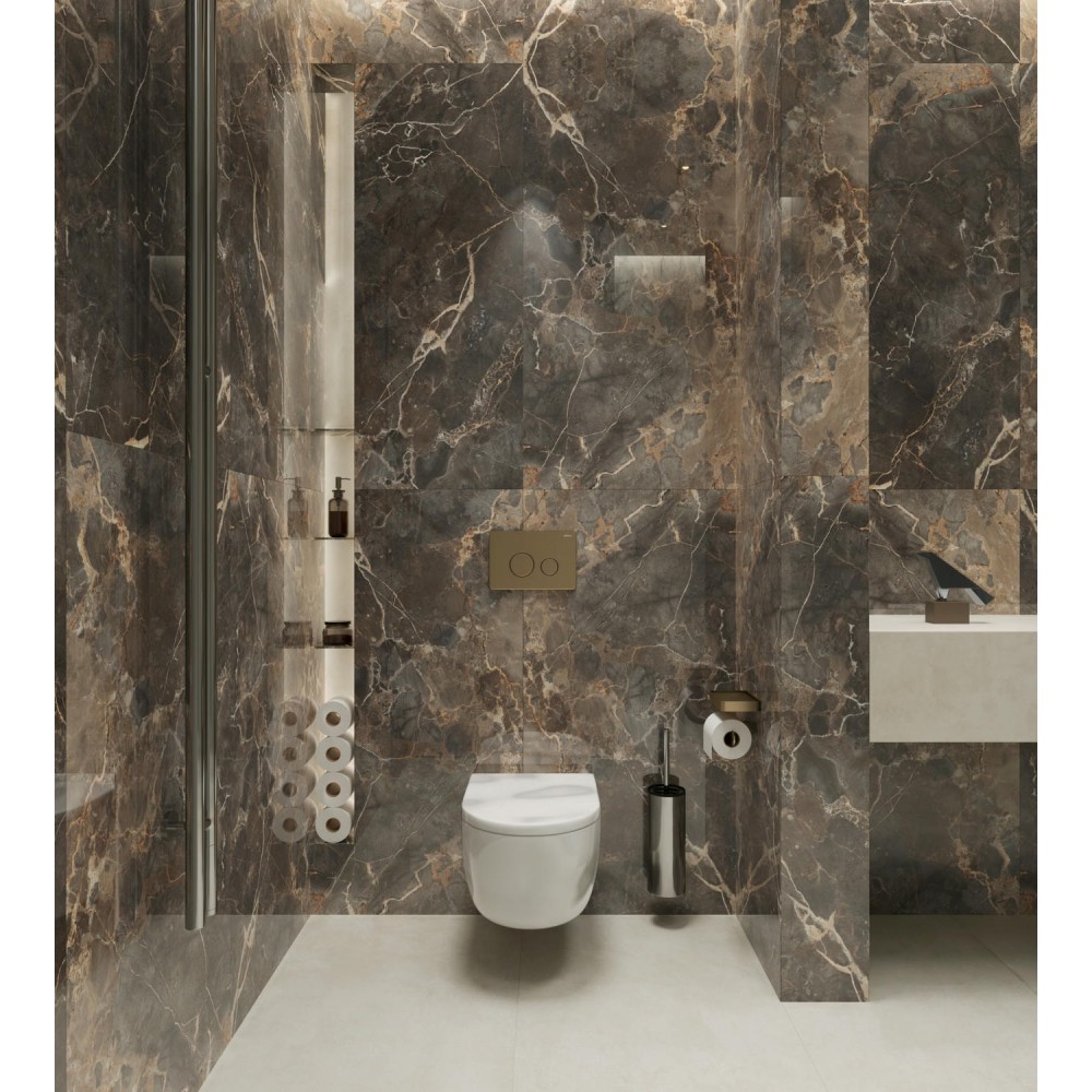 Керамогранит IMPERIAL NERO, обладающий теплым серым оттенком, с эффектом роскошного мрамора, переплетенного с изысканными золотыми и белыми линиями, создает атмосферу утонченной элегантности. Этот материал не только привносит нотки высокой эстетики, но и наполняет пространство светом и динамикой, подчеркивая каждую деталь оформления.