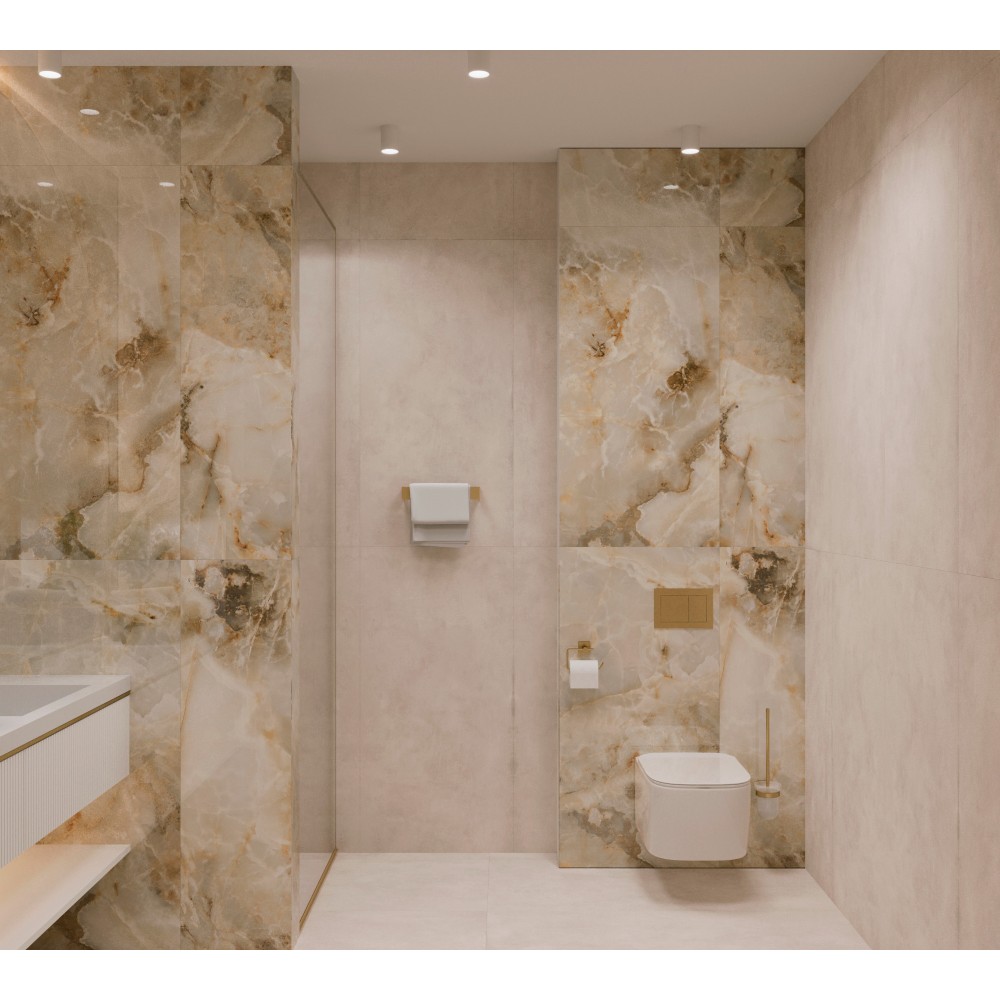 Керамогранит INVISIBLE ONYX — это идеальное решение для тех, кто стремится добавить в интерьер нотки изысканности и роскоши. Его дизайн имитирует природный оникс, известный своими уникальными узорами и теплыми оттенками. Полированная глянцевая поверхность не только создает эффект зеркальной игры света, но и визуально расширяет пространство, наполняя его воздухом и глубиной.