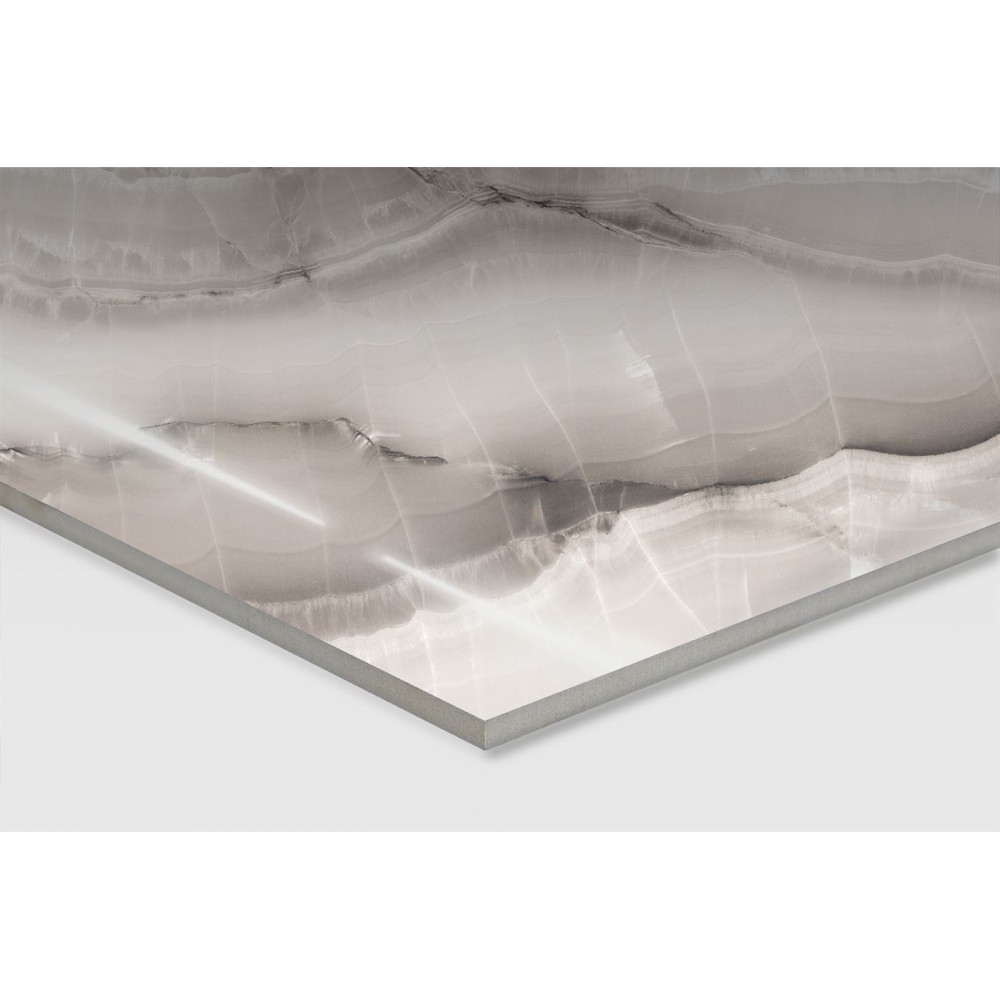 Керамогранит ONYX SILK, обладающий теплым серым оттенком, с эффектом роскошного оникса, переплетенного с изысканными белыми линиями, создает атмосферу утонченной элегантности. Этот материал не только привносит нотки высокой эстетики, но и наполняет пространство светом и динамикой, подчеркивая каждую деталь оформления.