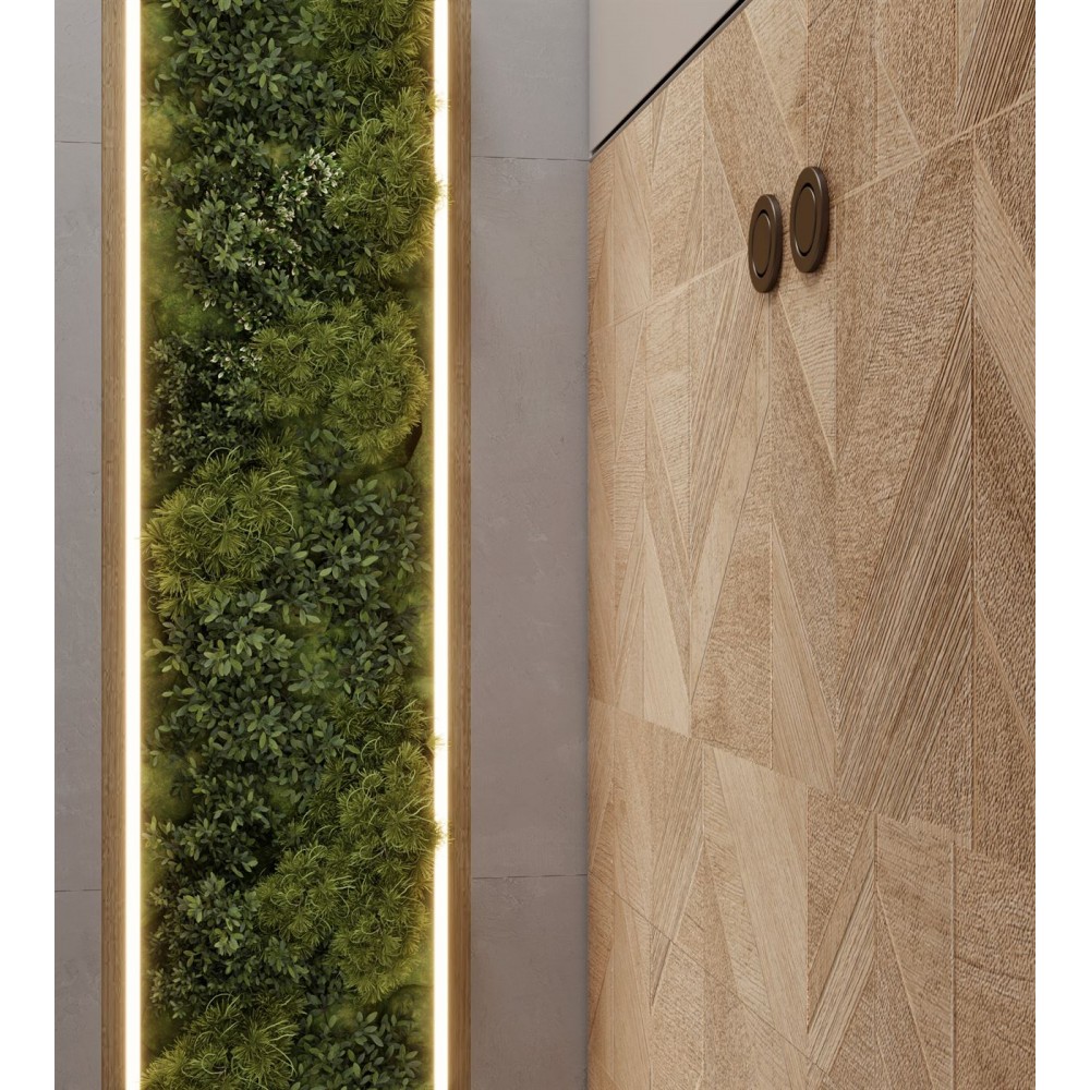 Поверхность материала детально передает все нюансы древесного рисунка. При этом керамогранит обладает всеми преимуществами искусственного покрытия: абсолютной влагостойкостью, устойчивостью к перепадам температур и простотой в уходе. Это делает его идеальным выбором для помещений с повышенной влажностью – ванных комнат, душевых, банных зон.